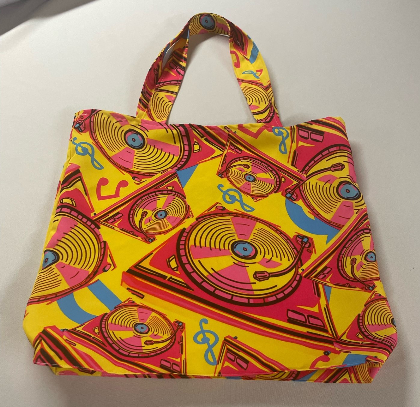 Beautiful, hand made cotton tote bags featuring our theme 'Off the Record'